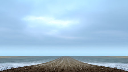 A tranquil view of an expansive horizon featuring a brown earth field meeting a calm blue sky, evoking feelings of peace and simplicity in nature's beauty.