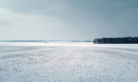 Beautiful winter field covered by snow and distant trees in tranquil landscape