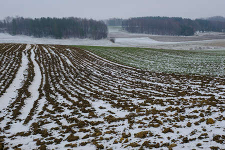 Slightly snowy fields in misty day. Furrows of the ground on fields. Forest on horizon.