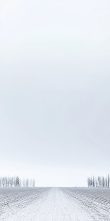 A vast snow-covered field extends towards the horizon surrounded by a few sparse trees. The sky is gray reflecting a calm winter atmosphere showcasing the beauty of the season.