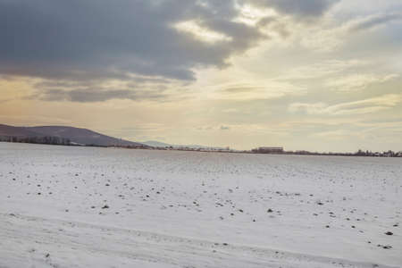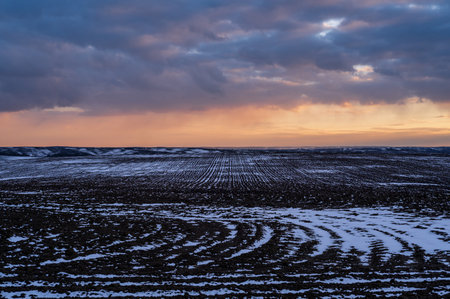Black earth, arable land covered with the last snow, early spring. Calm evening sunset in the Ukrainian countryside, Lviv region.