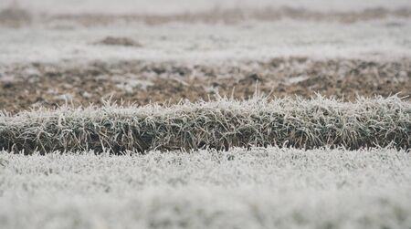 detail of small wheat growing in the field in rural area covered with frost during winter season in a foggy day
