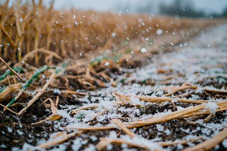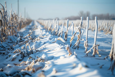 A field of corn is covered in snow. The snow is covering the ground and the corn stalks