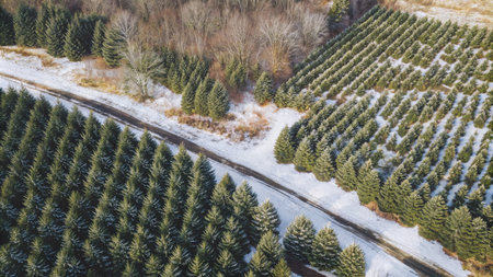 Aerial view of winter forest with snow covered trees. Drone photography.