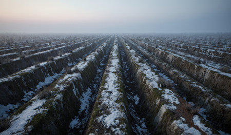 Rows of snowy fields extend into the distance under a hazy sky at dawn, creating a serene winter landscape.