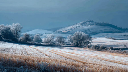 A serene landscape featuring rolling fields with snow accents under a misty sky, showcasing the tranquil beauty of nature at dawn in a picturesque rural setting.