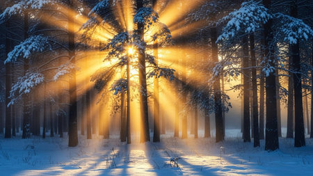 golden sunbeams dramatically pierce through the dense canopy of a snow-covered pine forest. The warm light creates a striking contrast with the cool blue shadows cast on the pristine white snow. Individual pine branches are laden with frost, and the sunlight filters through, illuminating the scene with an ethereal glow. captures the serene and tranquil beauty of a winter woodland at dawn or dusk, highlighting the interplay of light and shadow in a natural setting.