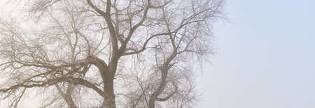 Dead tree trunk on foggy sky background. Sad autumnal tree.
