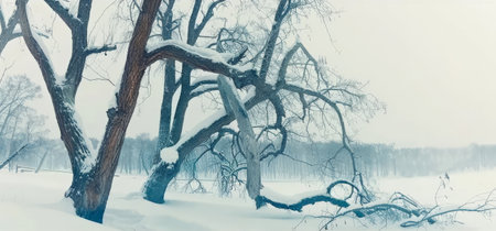 A sparse winter landscape where bare tree branches create delicate patterns against snow-covered ground and a pale sky, capturing winter's quiet, minimalist beauty.