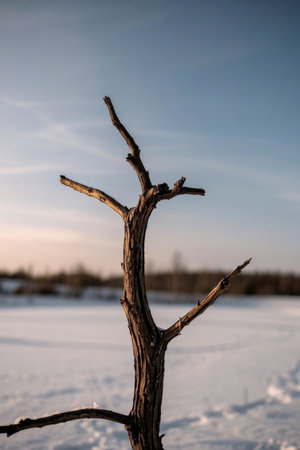 Against a stark winter sky, a solitary bare twig stands tall as a reminder of the power of nature, evoking a sense of loneliness and resilience