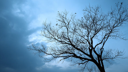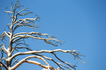 Dead tree silhouette on blue sky background. Nature background. Copy space.