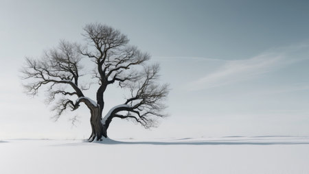 Vast snowy plain with a single tree for minimalist winter themes. A barren tree stands alone in the middle of an endless snowy
