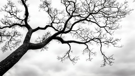 A striking black and white photograph showcasing the intricate branches of a leafless tree stretching towards a dramatic cloudy sky, creating an atmosphere of solitude and beauty.