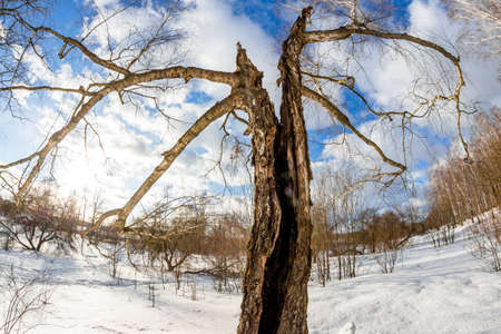Fisheye view of a broken birch tree in the middle of a winter landscape
