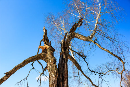 Trunk of a broken old birch against a blue sky