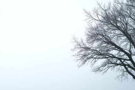 A striking silhouette of a leafless tree emerges from a dense fog, evoking feelings of solitude and introspection amidst a tranquil landscape.