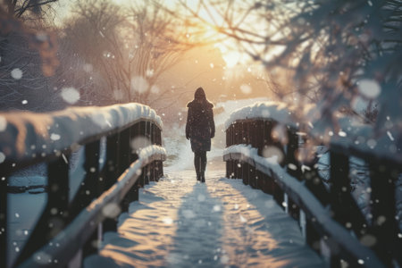A woman is walking across a bridge in the snow. The bridge is covered in snow and the woman is wearing a coat. The scene is peaceful and serene, with the snow creating a quiet atmosphere