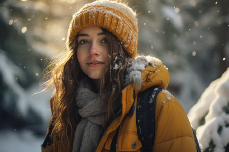 shot of a young woman out in the snow, created with generative ai