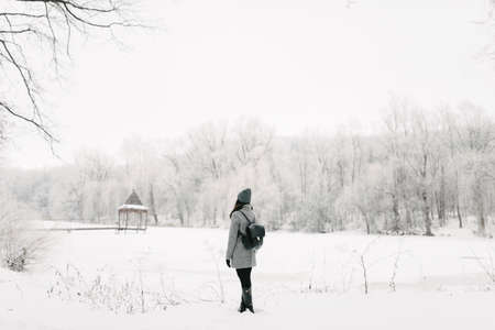 Woman walking in the winter forest. Back view of young woman with a backpack walking in winter forest.