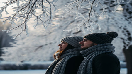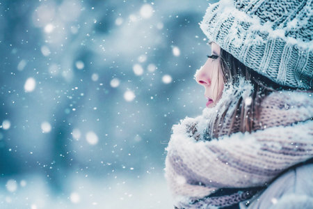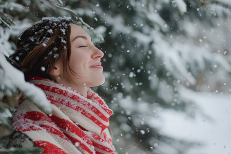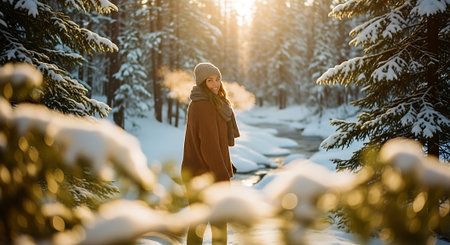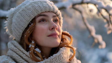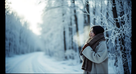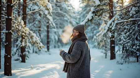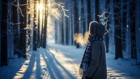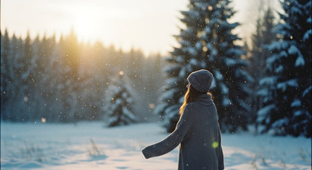 A serene winter scene depicting a woman in a cozy beanie and scarf, gazing at a snowy forest landscape, evoking feelings of tranquility and exploration.