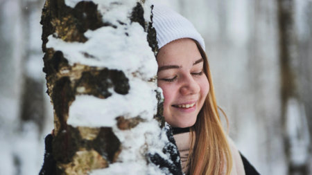 Beautiful sweet girl smiling, standing in winter forest or snowy park. She has happy relaxed face. Woman enjoying walk, breathing fresh frosty air