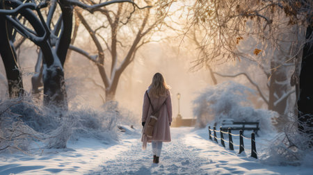 A woman walking in a snowy landscape during twilight, holding a coffee cup, with soft glowing lights in the background