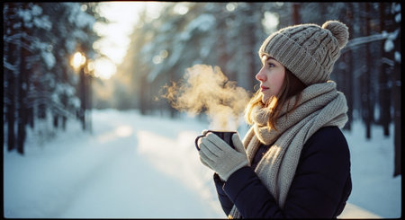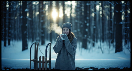 A woman in a cozy sweater and hat holding a steaming cup in a snowy forest, with a sled nearby and sunlight filtering through the trees