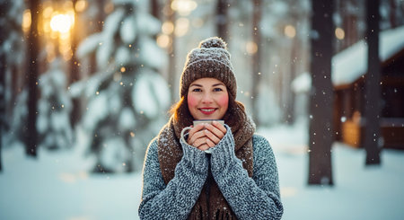 A young woman in a winter setting, wearing a cozy hat and scarf, holding a steaming cup of coffee, smiling amidst falling snow