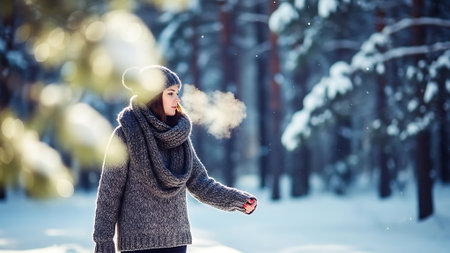 Beautiful woman smoking electronic cigarette in the winter forest. Copy space
