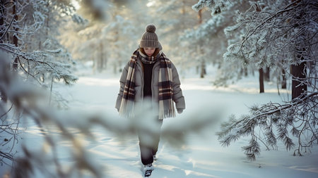 A person walking through a snowy forest path during a gentle snowfall in wintertime, wearing a cozy hat and scarf