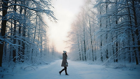 Woman walking in winter forest at sunset. Beautiful winter forest landscape.