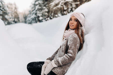 Beautiful young woman sitting on the snow in a winter park.