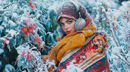 A young woman wearing a large scarf, standing in a snowy landscape with evergreen trees in the background