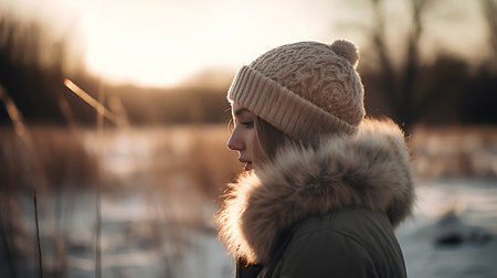 Generative AI Image of Asian Girl Wearing Warm Clothes in Field in Snow Winter Season