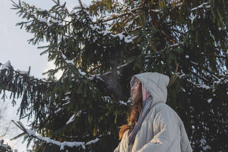A young man smiles in a snowy winter forest. A guy walks outside in a park. Portrait of a man in the fresh air in winter. An active lifestyle in winter during vacation or holidays