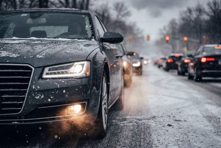 A close up view of a dark grey car front with illuminated headlights driving on a snowy road during a cold winter day with heavy traffic congestion in the background.