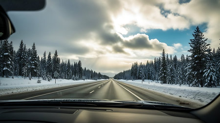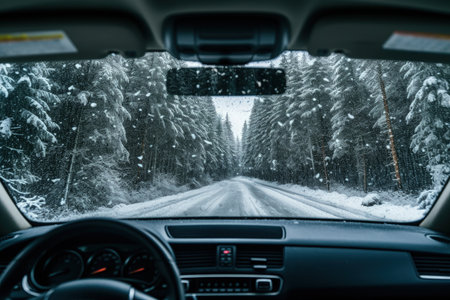 Stunning snowy coniferous forest view from car s windshield