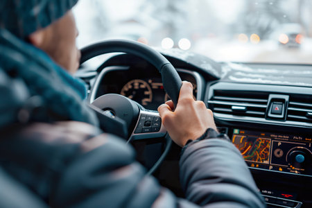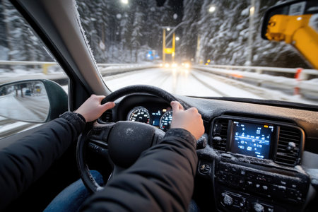 On a snowy day, a driver grips the steering wheel, preparing to start the engine as the dashboard lights shine brightly.