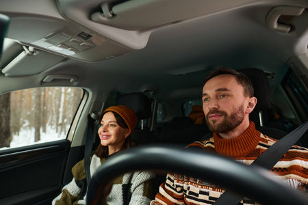 Modern Caucasian couple enjoying winter trip, bearded man driving car and listening to his wife