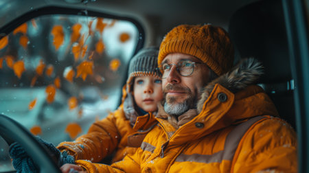 A father and his young son enjoy a bonding moment during a road trip. They are warmly dressed, surrounded by vibrant autumn leaves. The scene conveys warmth, family connection, and adventure.