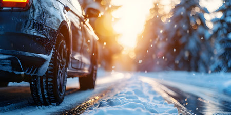 Concept illustration of close-up of the wheels of a car with winter tires on a snowy road in the forest