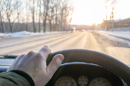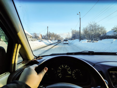 Riding behind the wheel of a car in winter. first-person view