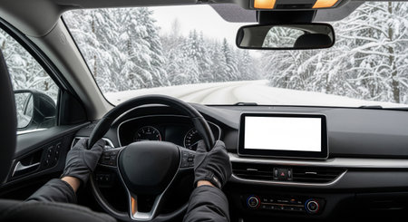 An in-car view of hands on the wheel with a snowy road ahead in daylight; a blank screen keeps the scene generic for safety messaging.