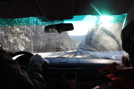 Man and woman in the car. Man is driving the car on the beautiful snowy road. Weather is sunny. Winter car trip, local tourism concept