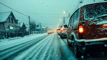 a winter snow covered road in a city, concept of traffic safety on a slippery road