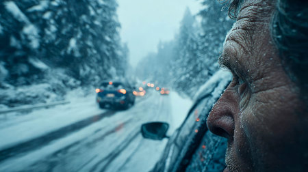 Elderly man driving through a snowy road, viewed from inside the car with frosty windshield.