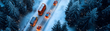 Aerial view of Christmas decorated trucks in traffic jam carrying gifts on the road in a winter forest covered with snow in snowfall.