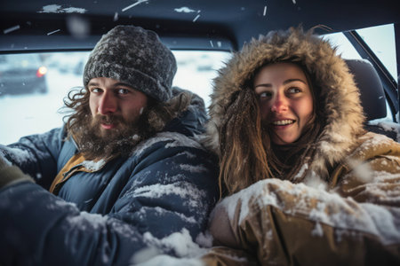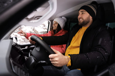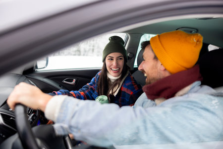 Cheerful couple in love having fun driving a car while travelling to a winter vacation road trip