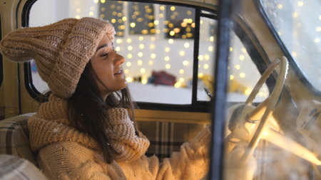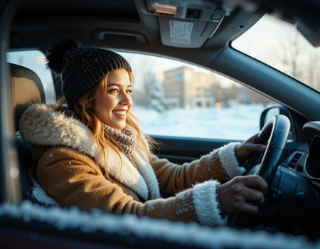 A young woman sits in a car, wrapped in a warm scarf and hat, smiling joyfully as snow falls outside, capturing the essence of winter beauty and comfort.