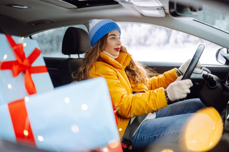 A beautiful woman driving a car carries New Year's gifts along a snowy road. Shopping concept.